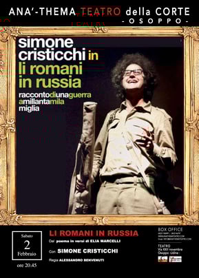 Tratto dall’omonimo poema in versi di E. Marcelli, il monologo “Li Romani in Russia” racconta l’orrore della guerra attraverso la voce di chi l’ha vissuta in prima persona, come in un ideale incontro tra il mondo delle borgate di Pasolini e le opere di Rigoni Stern e Bedeschi. Un teatro civile che si presenta nuovo soprattutto per la forma del testo. Il risultato è un affresco epico che non omette particolari crudi e rimossi dalla storia ufficiale (il luogo comune degli italiani brava gente), e che diviene quanto mai attuale in un’epoca di bombe intelligenti e guerre umanitarie. Cristicchi, attore naturale e credibile, interpreta una nutrita galleria di grotteschi personaggi, raccontando con passione e coinvolgimento questa tragica epopea, in un monologo corale in cui trovano spazio anche momenti ironici e divertenti.