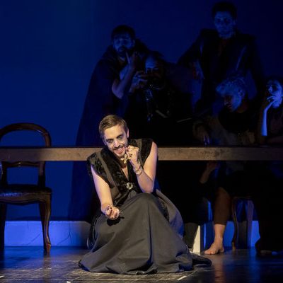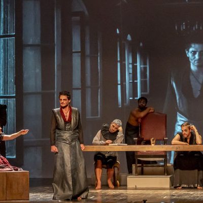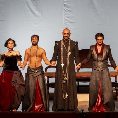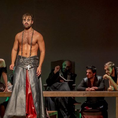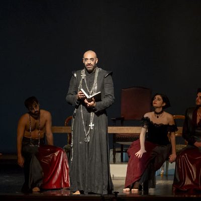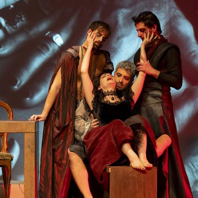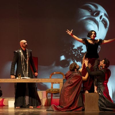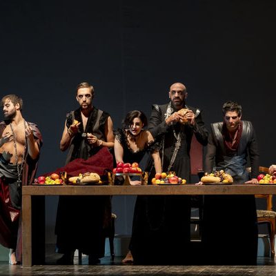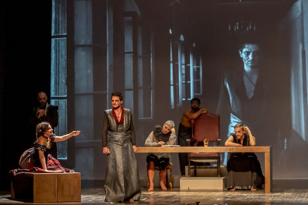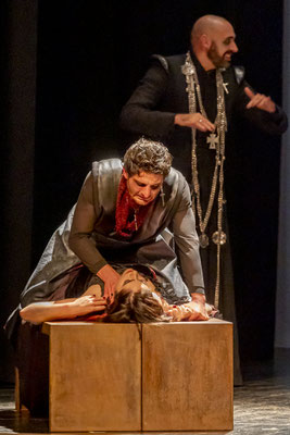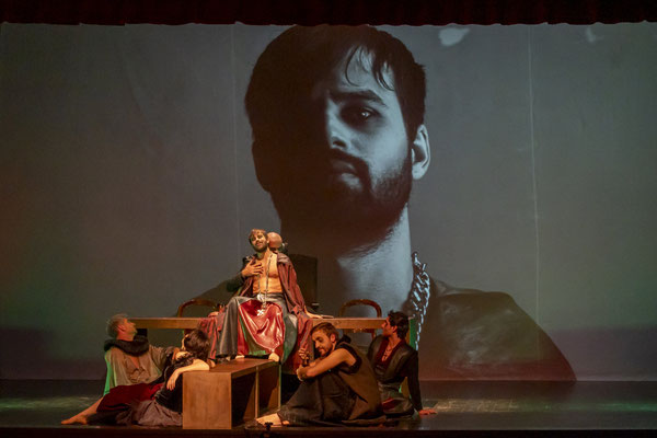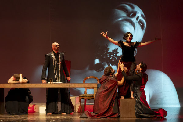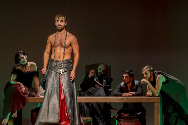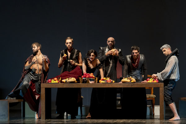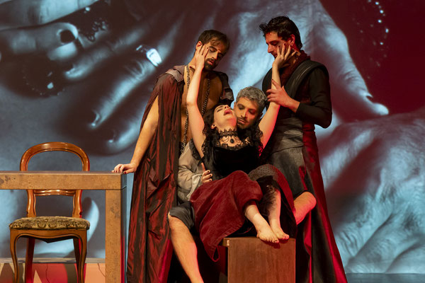 Regna sulla scena il grande fondale sul quale appaiono i filmati realizzati da Igori Nazarco, Helena Cleofe Finati e Elia Piccoli, che mostrano “l’intimità” e la radice stessa del peccato che si sta svolgendo sul palcoscenico e che, mescolati ai costumi da dei oscuri e atemporali di Emmanuela Cossar con le musiche eseguite solo da violini e violoncelli, creano un’atmosfera sospesa e suggestiva.