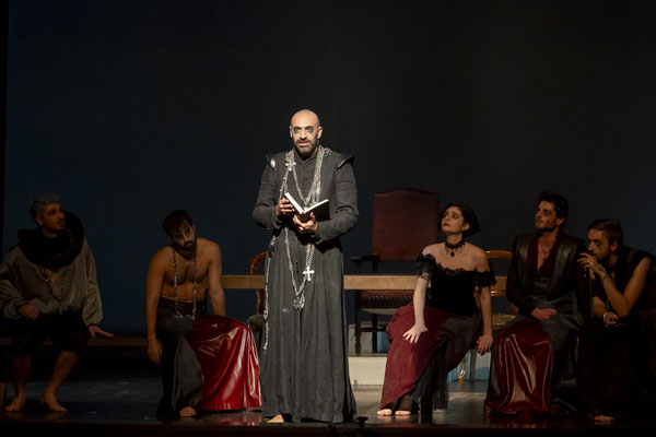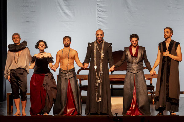 I personaggi che identificano i peccati sono i grandi protagonisti delle opere Shakespeariane: Jago con l’invidia (Luca Ferri), Amleto con l’accidia (Luca Marchioro), Shylock con l’avarizia (Alberto Fornasati), Cleopatra con la lussuria (Giulia Cosolo), Macbeth con la superbia (Massimiliano Kodric), Otello con l’ira (Giulio Macrì) ed in fine la Gola che apre lo spettacolo e viene rappresentata da tutti gli attori insieme.