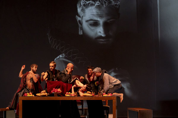 Sulla scena un lungo un tavolo di divinità fuori dal tempo e dallo spazio che, in relazione con Dio, padre di tutto e anche dei peccati stessi, interagiscono tra loro attraverso i diversi quadri che compongono il lavoro.